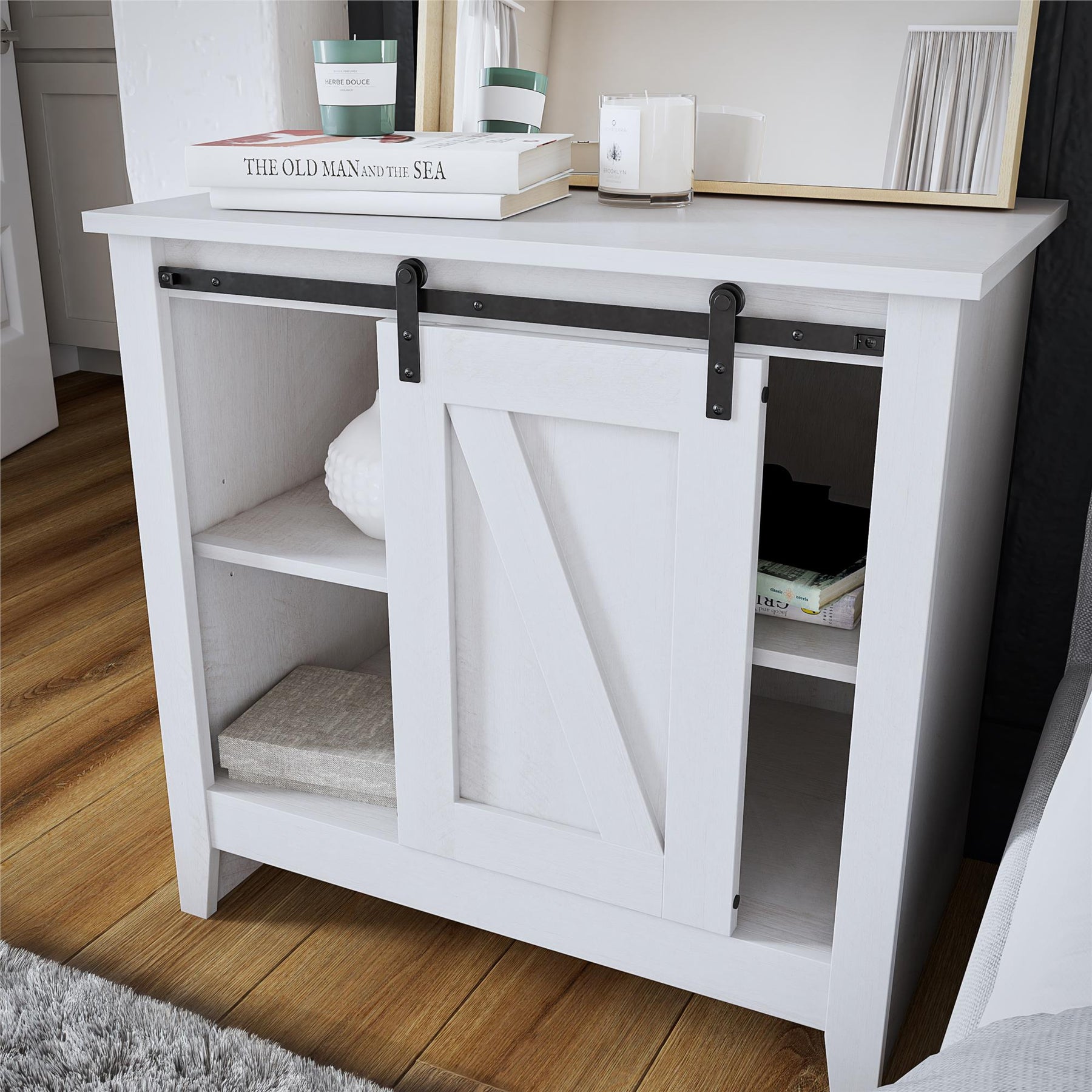 Alton Nightstand with Sliding Barn Door and 4 Shelves