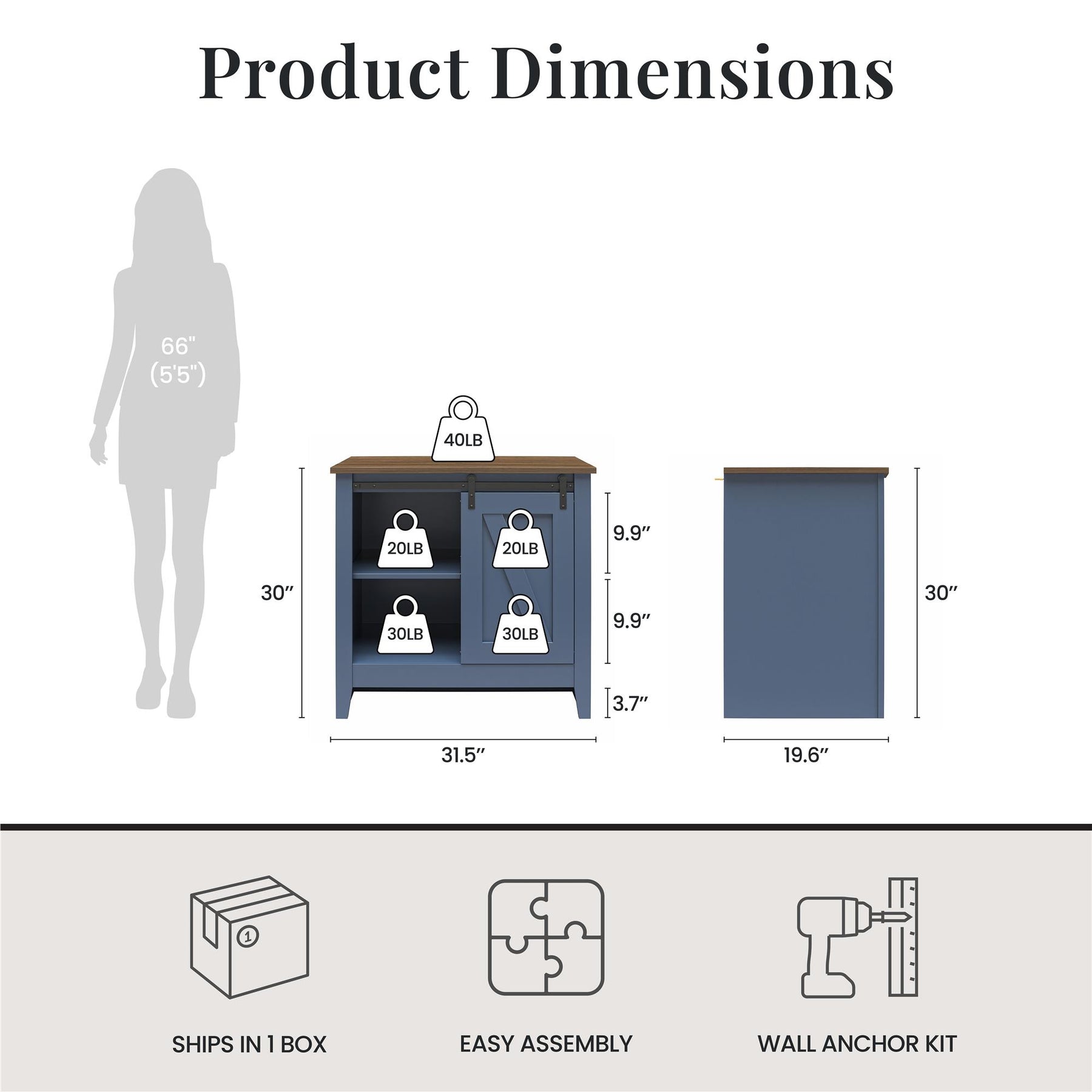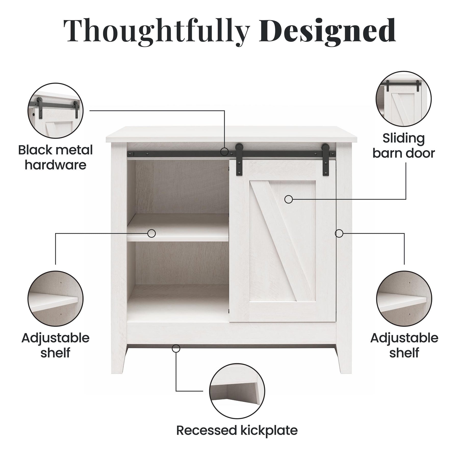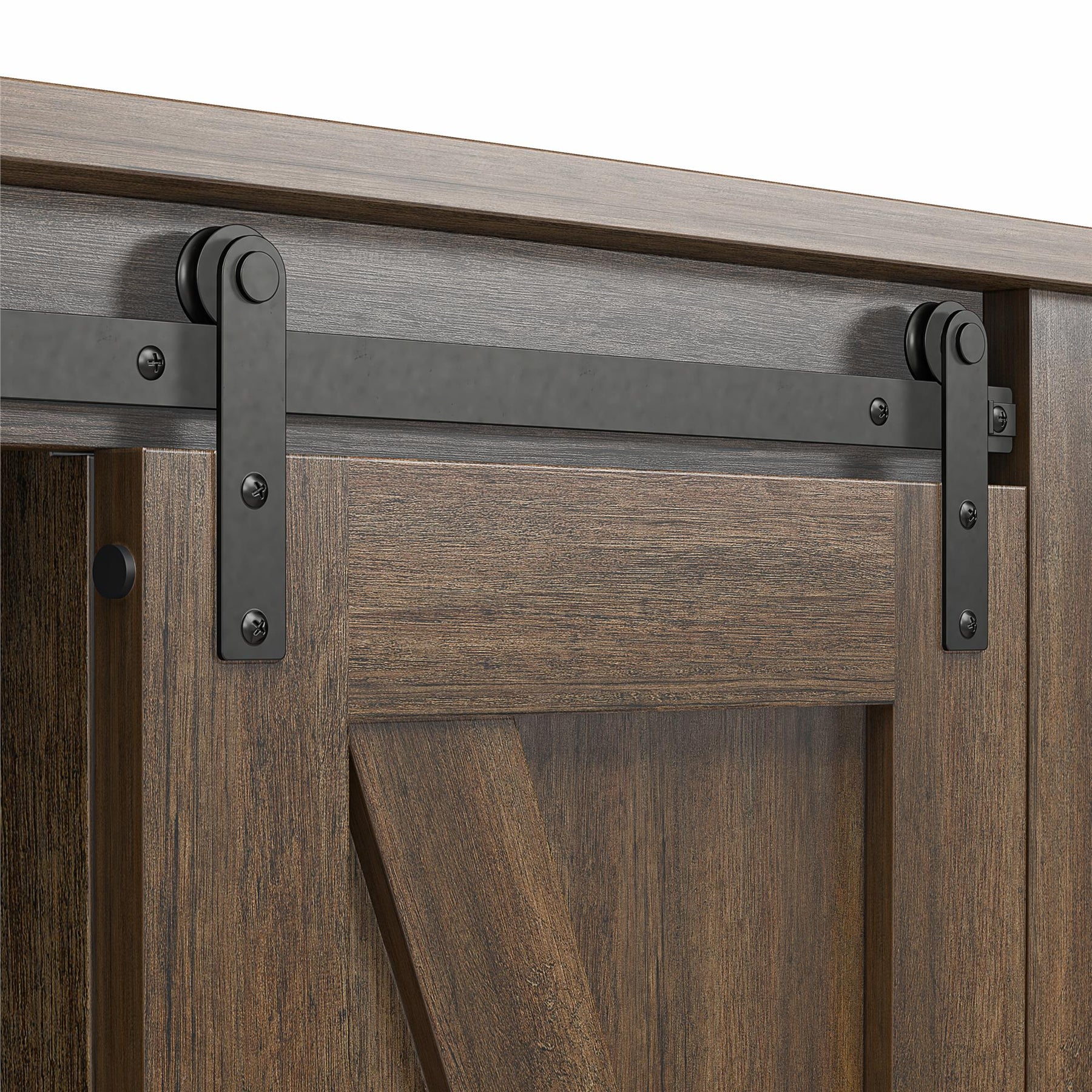 The RealRooms Alton Nightstand with 4 Shelves brings you a farmhouse-style, multi-functional wooden nightstand featuring a recessed panel sliding barn door that glides smoothly on matte black metal rail tracks with rustic corner brackets, allowing you to hide or display shelving on either side as needed. Constructed from durable laminated engineered wood with a secure back panel and recessed toe kick, this 31.5"-wide bedside table offers exceptional storage with four generous compartments, including two adjustable shelves for customized side table organization. Perfect as a night table in your bedroom or an end table in your living room, this storage nightstand for bedrooms supports 20 lbs. on upper shelves, 30 lbs. on lower shelves, and 40 lbs. on its tabletop. Measuring 31.5"L x 19.6"W x 30"H, this accent table pairs beautifully with matching nightstands, dressers, and chests from our collection (each sold separately) to create a cohesive look throughout your home.