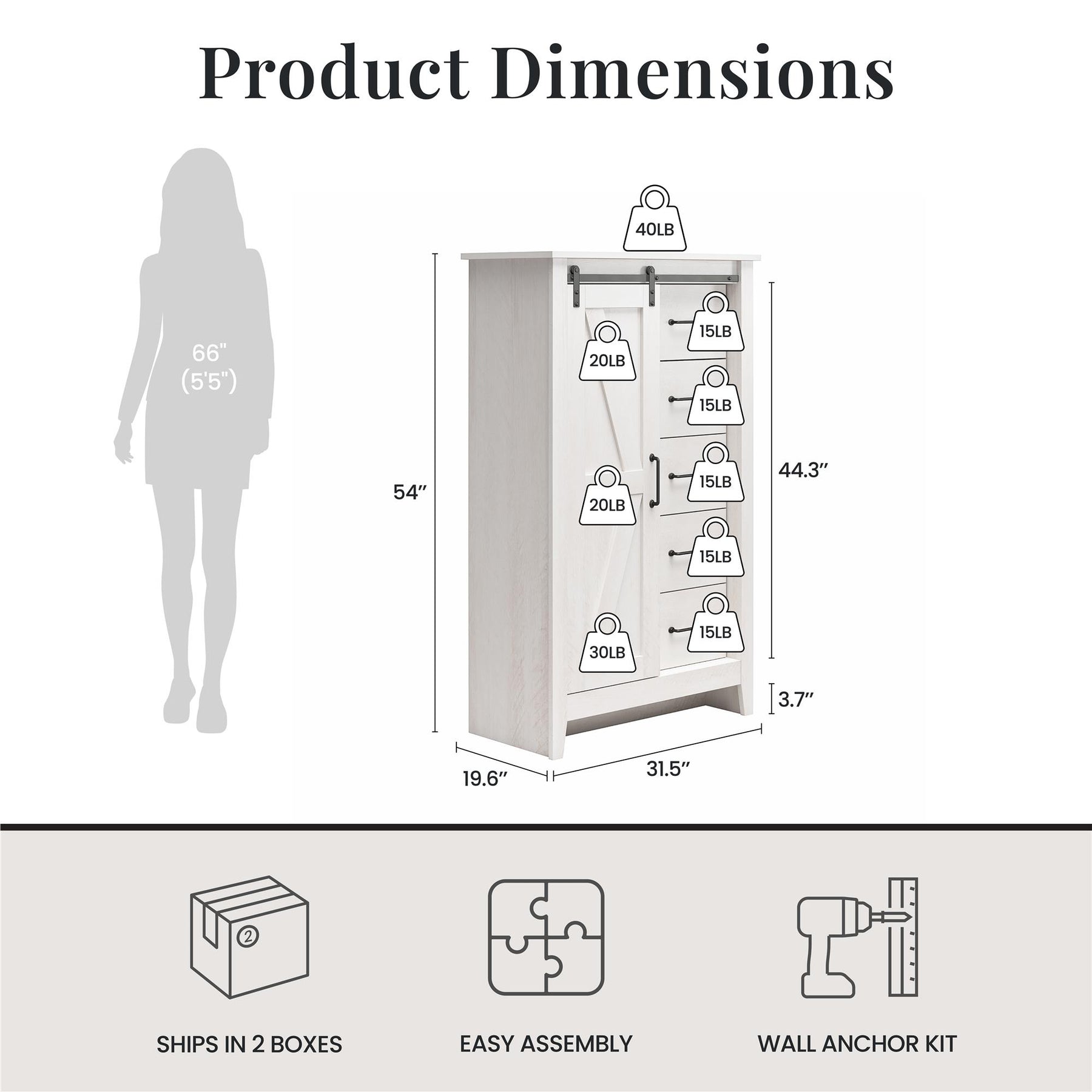 The 54"-tall RealRooms Alton 5-Drawer Dresser with 3 Shelves features a recessed-panel sliding barn door that glides effortlessly on matte black metal rail tracks, allowing you to conceal or showcase items stored within the three compartments--including one adjustable shelf for customized bedroom storage. Crafted from durable laminated engineered wood with a secure back panel and recessed toe kick, this rustic 31.5"-wide gentleman's chest showcases distinctive metal corner brackets and antique-style handles that enhance its farmhouse appeal. Each smooth-gliding drawer supports 15 lbs., while the upper and middle shelves hold 20 lbs. each, and the lower shelf supports 30 lbs. Measuring 31.5"L x 19.6"W x 54"H, this multifunctional bedroom chest with shelves works beautifully as a wood chest of drawers or storage cabinet in bedrooms, living rooms, or entryways with a 40 lb. tabletop capacity. Complete your home's cohesive look by pairing with matching nightstands, dressers, and chests from our collection (each sold separately).