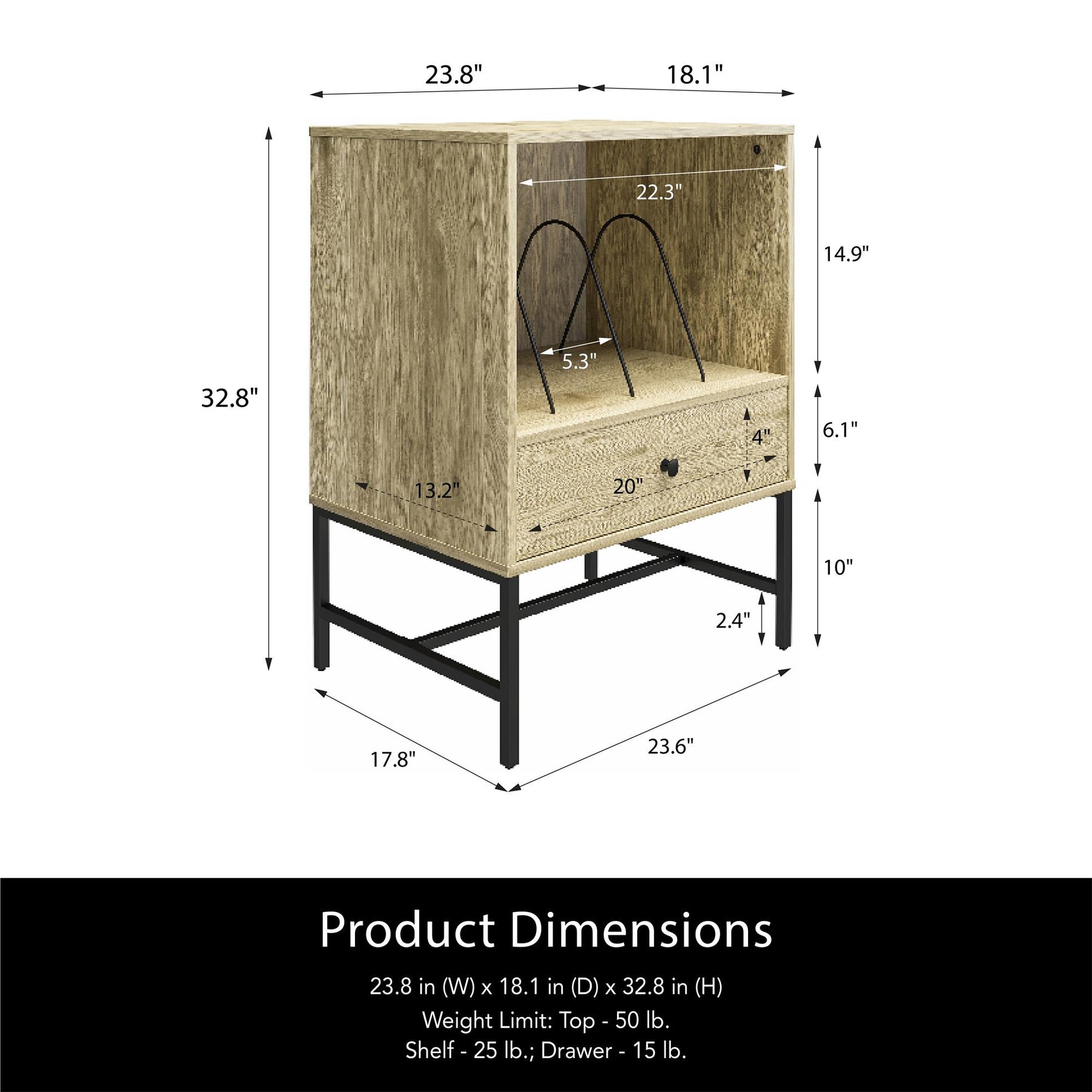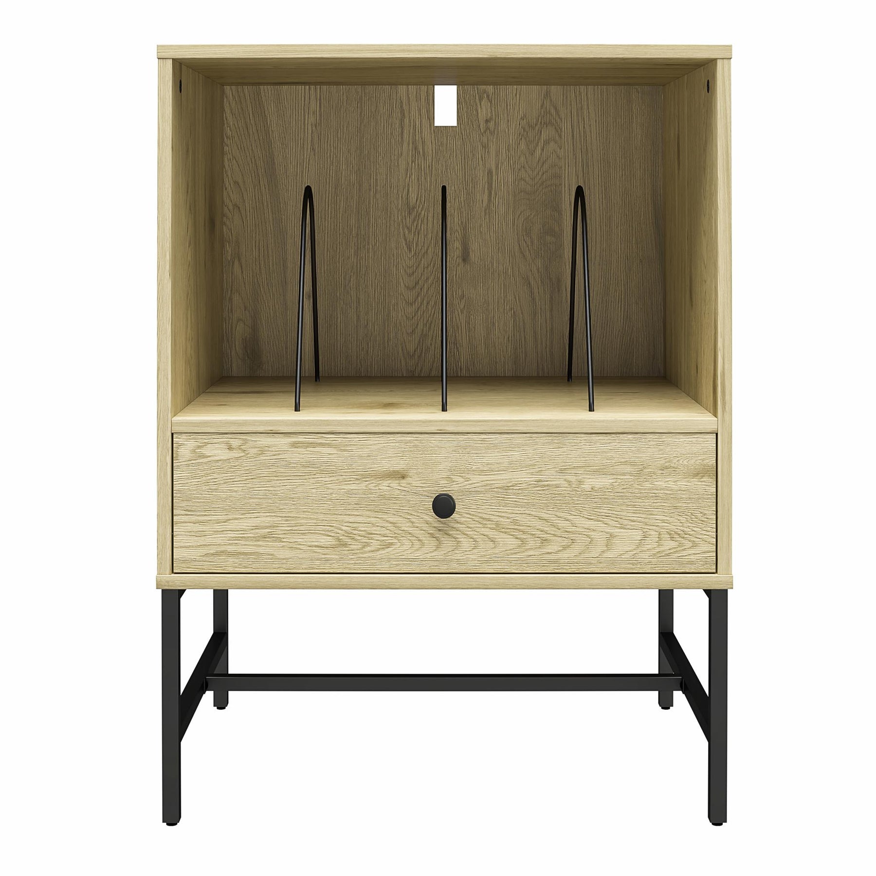 Lean into your inner retro-self and vibe out with the Brookville Record Station by RealRooms. The 3 dividers in the open cubby make it easy to know just where your favorite hits are stored when you have the urge to jam out. The sleek lower drawer adds a bonus storage space to this record stand to hide all your coasters, pens, paper and remotes. Made from durable engineered wood in a laminated natural woodgrain finish and powder coated metal, the Brookville collection features fashion forward statement pieces at an affordable price. This record stand ships flat to your door. Two adults are recommended for assembly. Assembled dimensions: 32.8"H x 23.75"W x 18.1"D.