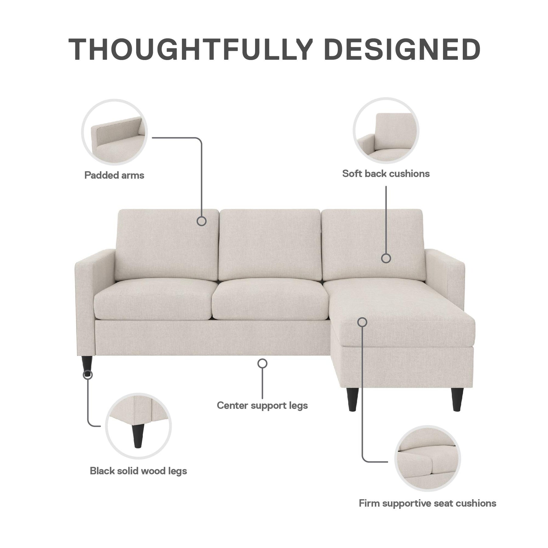 Featuring a contemporary design with a modern twist, the RealRooms Coral Reversible Sectional Sofa is the ideal three-seater L-shaped sectional for your home. Wondering why? Well, this stylish couch boasts beautiful and plush upholstery, along with pocketed coil seats that ensure optimal comfort during movie nights or afternoon snoozes. Moreover, the Coral is constructed with a sturdy wood frame and rests on solid wood legs finished in black, guaranteeing its durability for years to come. Additionally, the chaise can be positioned on either side of the sectional to suit your living room layout. With a range of color and material choices available, the RealRooms Coral Reversible Sectional Sofa is the perfect furniture piece to complement your living room decor. Don't hold out any longer!