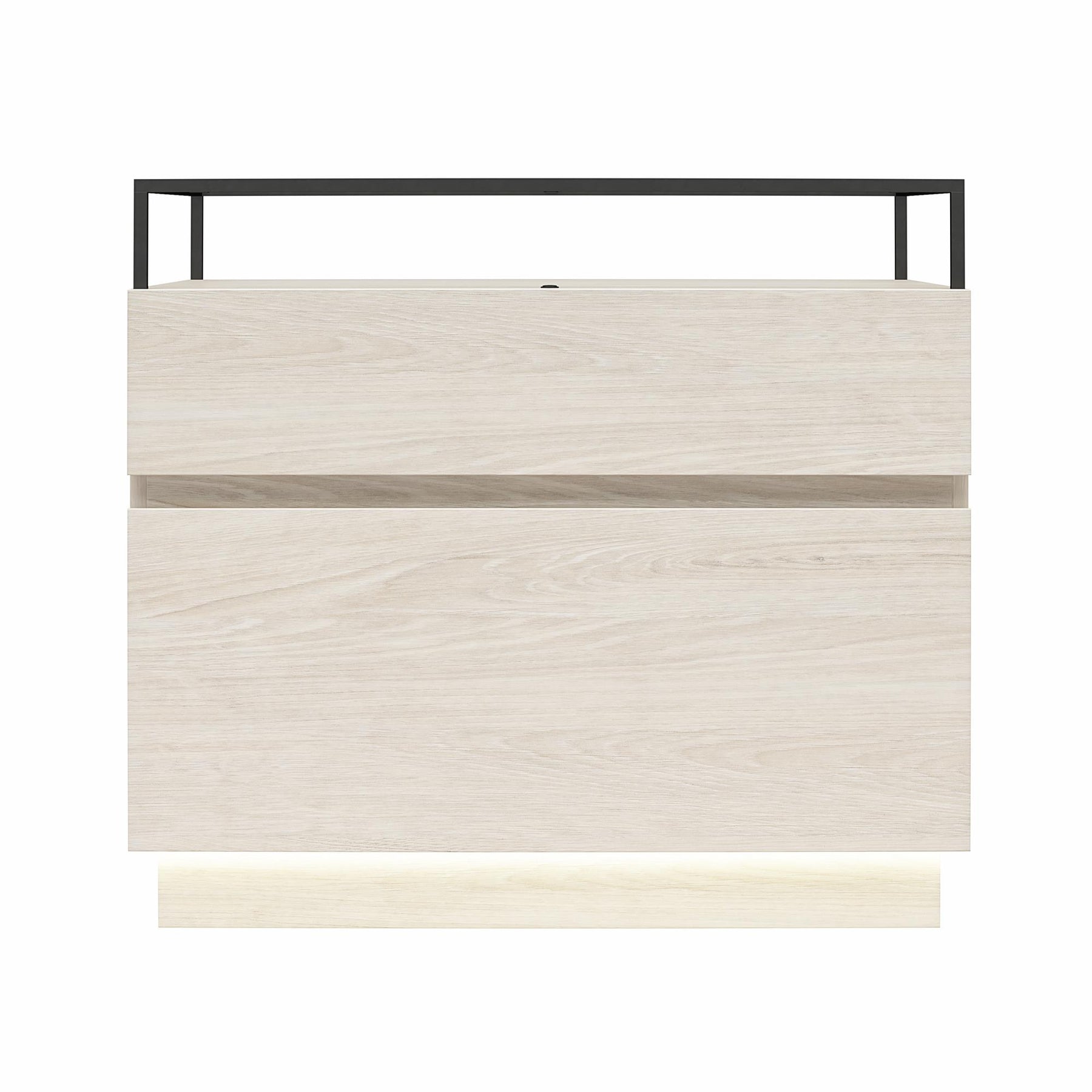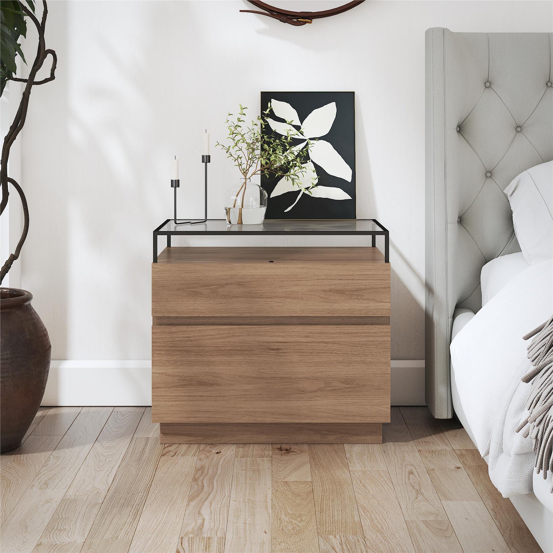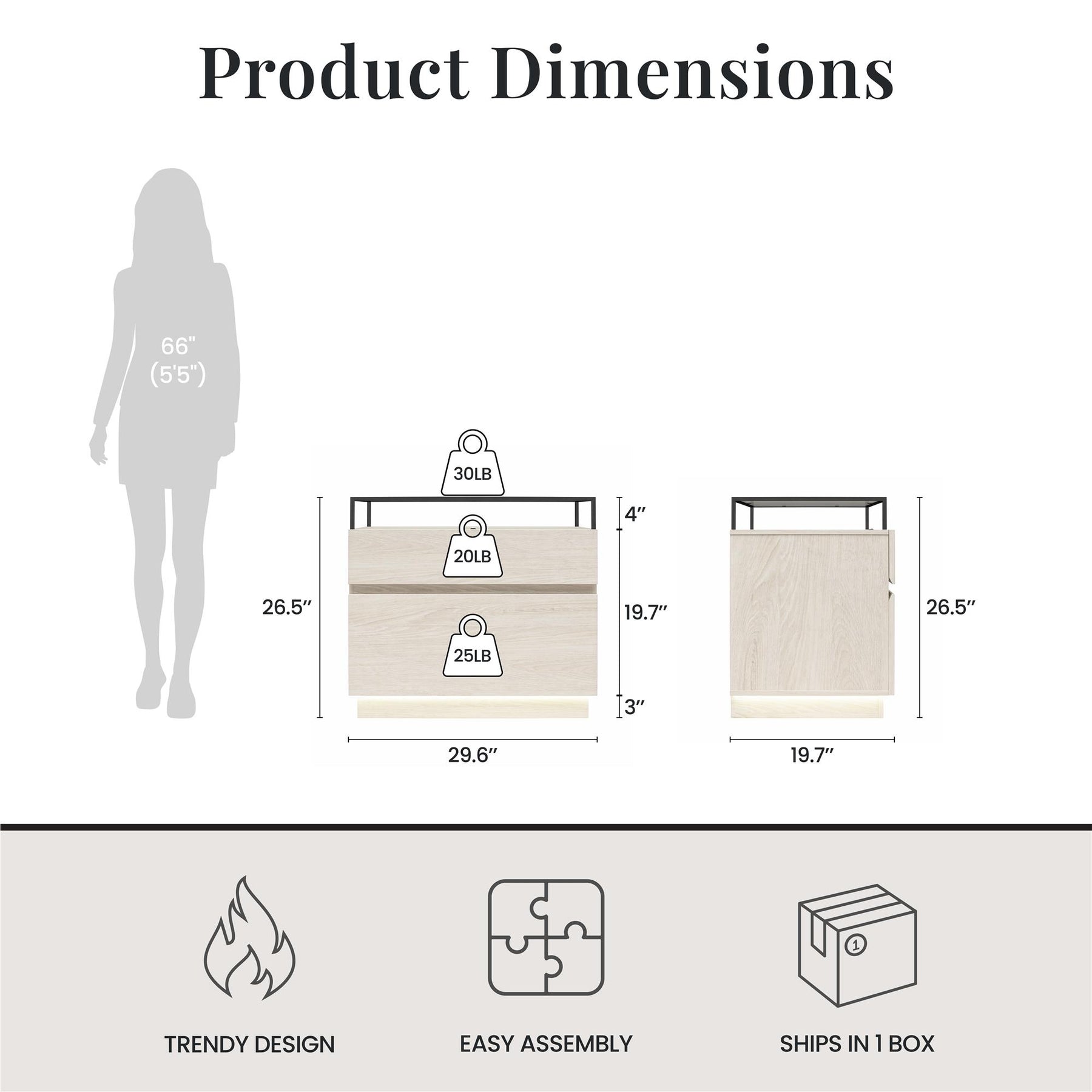 With the RealRooms Devon 2-Drawer Nightstand, even your favorite novels and phone charger will feel like they're living in the lap of luxury, adding a touch of class to your nightly routine. Featuring a sleek, clear, tempered-glass top display with a wooden surface beneath, this bedside table is designed to impress. The two drawers, one small top drawer and one larger lower drawer, offer ample storage for your essentials. The recessed base is adorned with LED strips that emit a warm white glow on the ground below, creating a cozy ambiance. Crafted from durable engineered wood, clear tempered glass, and a powder-coated steel frame, this modern nightstand for bedrooms promises enduring quality and timeless appeal. The LED nightstand ships in one box and requires assembly by two adults. 5V USB adapter not included. Once assembled, the night table measures 29.6" W x 26.5" H x 19.7" D. Discover the full range of bedroom items in the Devon collection to craft a sanctuary that reflects your style.