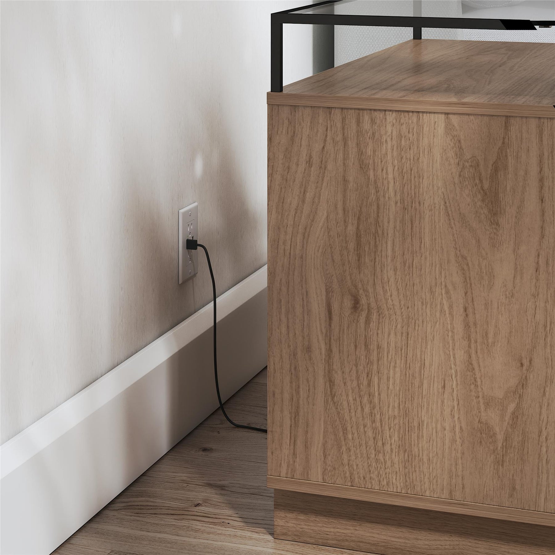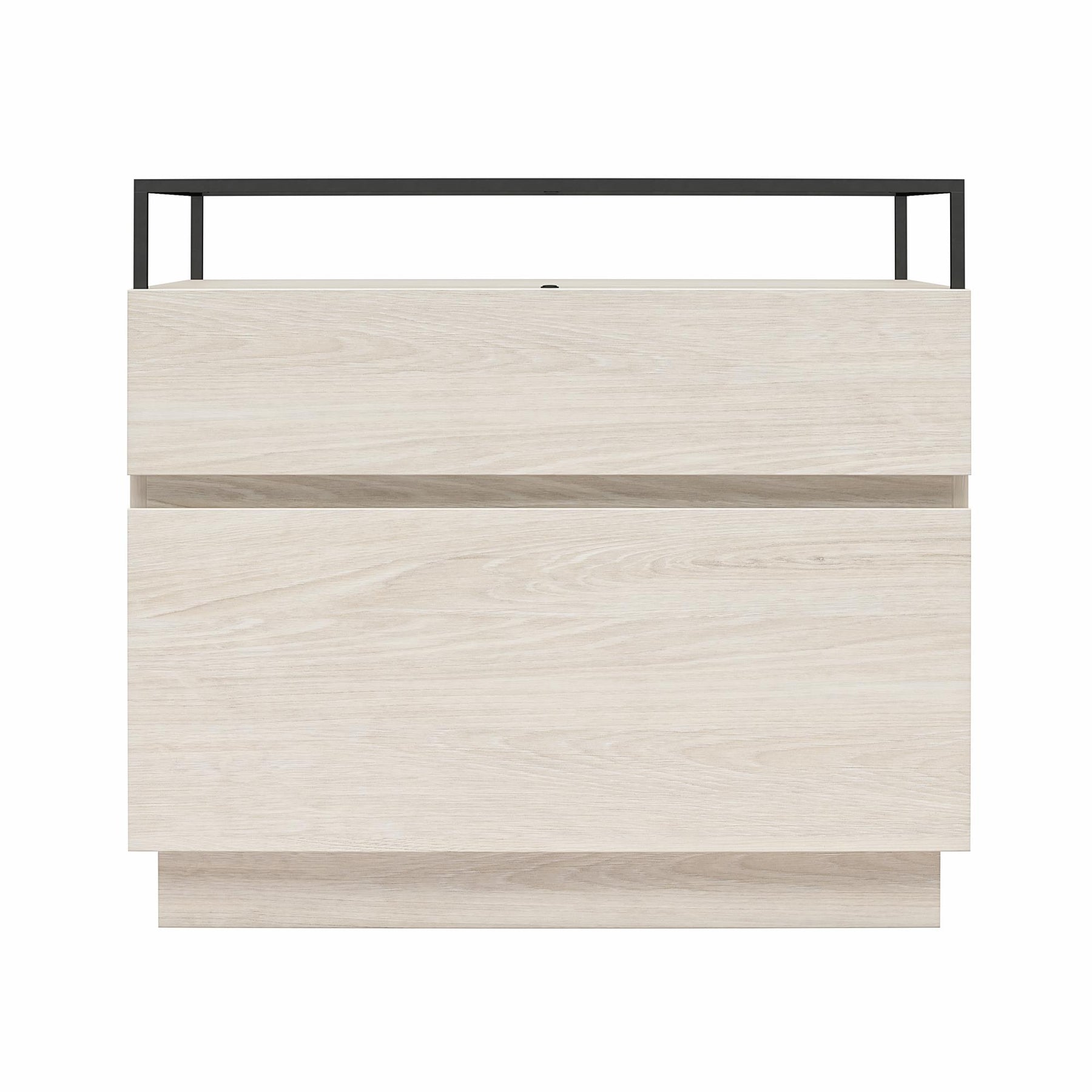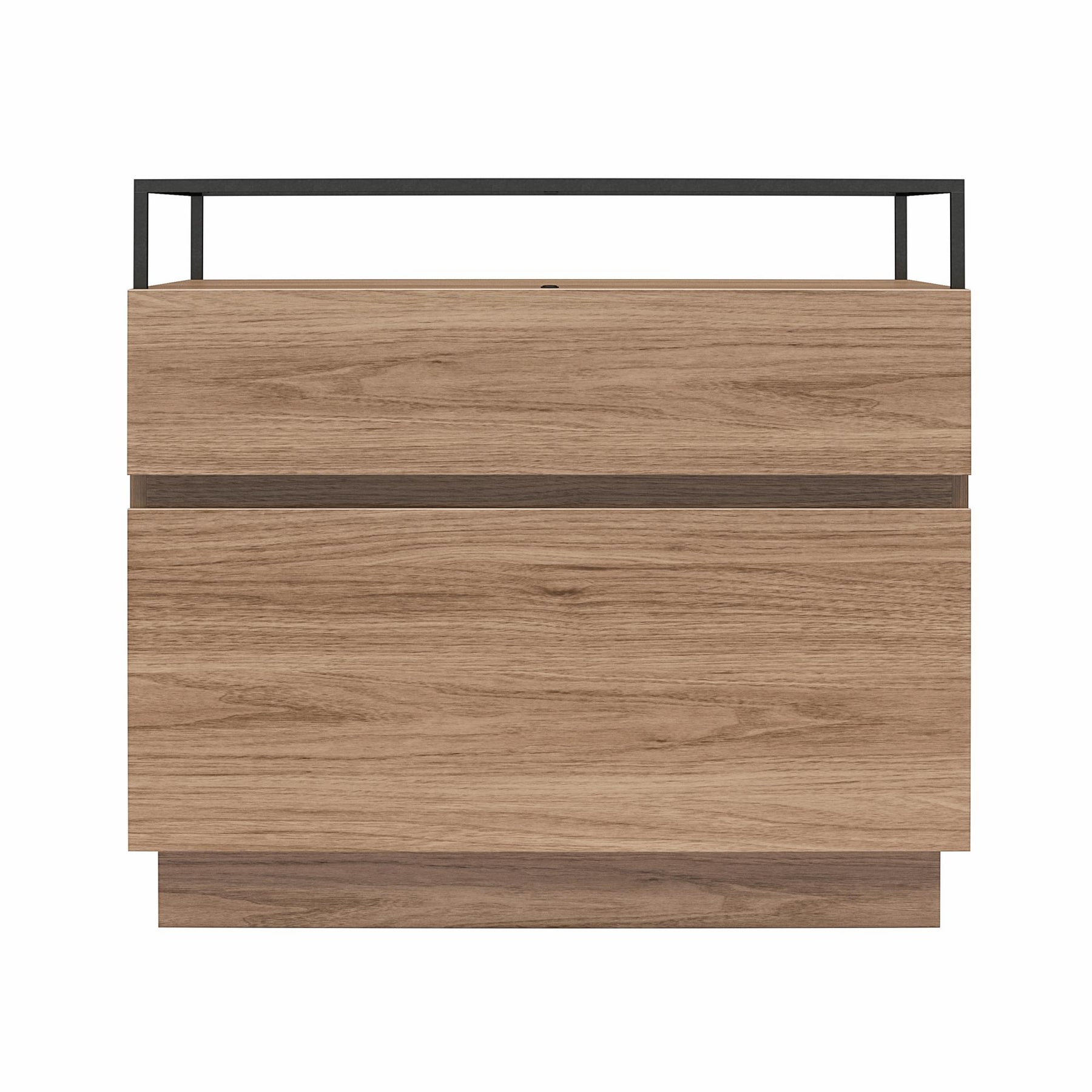 With the RealRooms Devon 2-Drawer Nightstand, even your favorite novels and phone charger will feel like they're living in the lap of luxury, adding a touch of class to your nightly routine. Featuring a sleek, clear, tempered-glass top display with a wooden surface beneath, this bedside table is designed to impress. The two drawers, one small top drawer and one larger lower drawer, offer ample storage for your essentials. The recessed base is adorned with LED strips that emit a warm white glow on the ground below, creating a cozy ambiance. Crafted from durable engineered wood, clear tempered glass, and a powder-coated steel frame, this modern nightstand for bedrooms promises enduring quality and timeless appeal. The LED nightstand ships in one box and requires assembly by two adults. 5V USB adapter not included. Once assembled, the night table measures 29.6" W x 26.5" H x 19.7" D. Discover the full range of bedroom items in the Devon collection to craft a sanctuary that reflects your style.