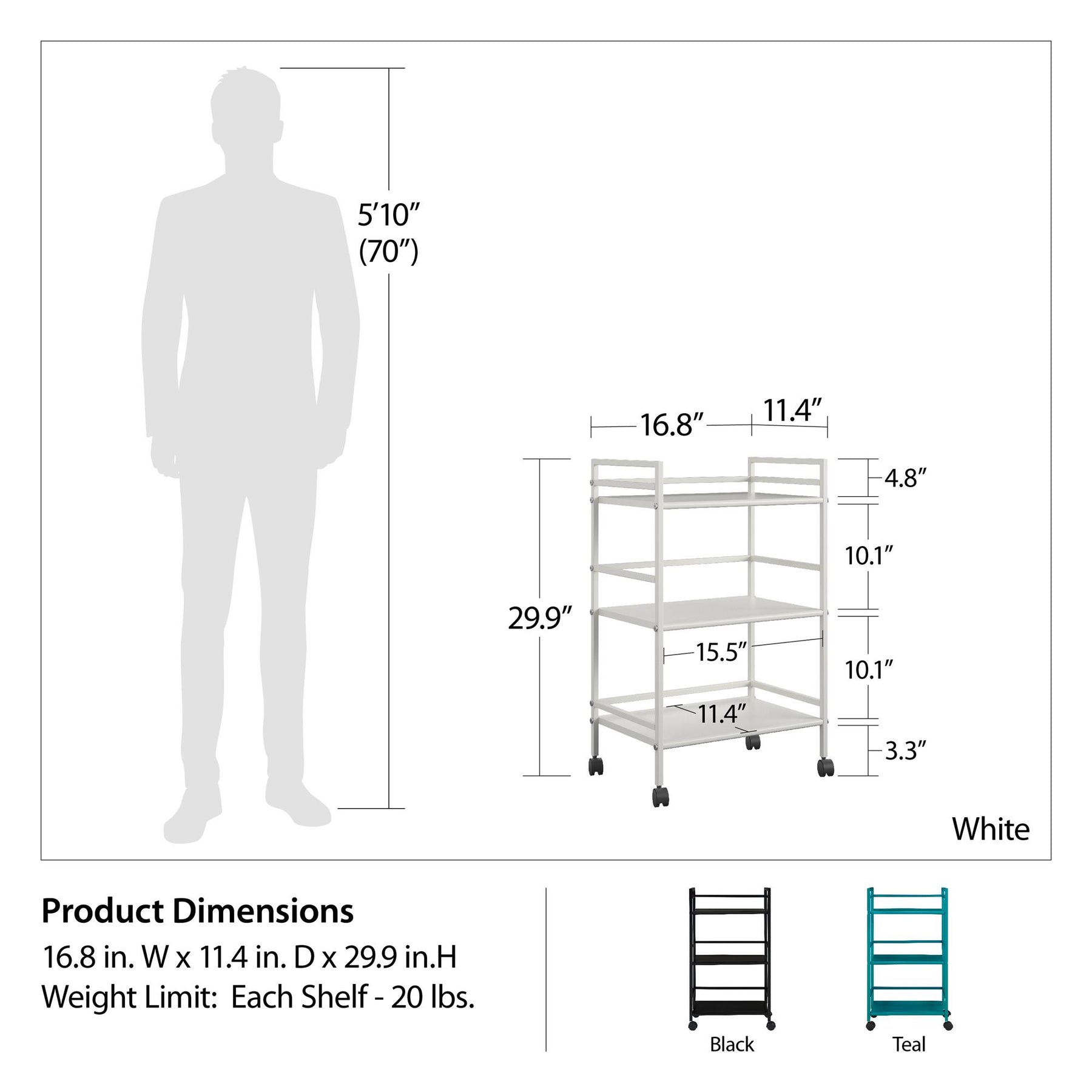 From the living room to the bathroom to the kitchen and beyond, the Ameriwood Home Marshall 3 Shelf Metal Rolling Utility Cart is a great addition to your home. Featuring a minimalistic style, the cart has 3 large shelves. Each shelf has 3 wraparound bars and can hold up to 20 lbs. Easily roll the cart from room to room on the 4 casters, 2 of which lock into place. Thanks to the black powder-coated metal finish, it will look great with any color scheme. Assembly is required, and the final dimensions are 29.9"h x 16.85"w x 11.4"d.