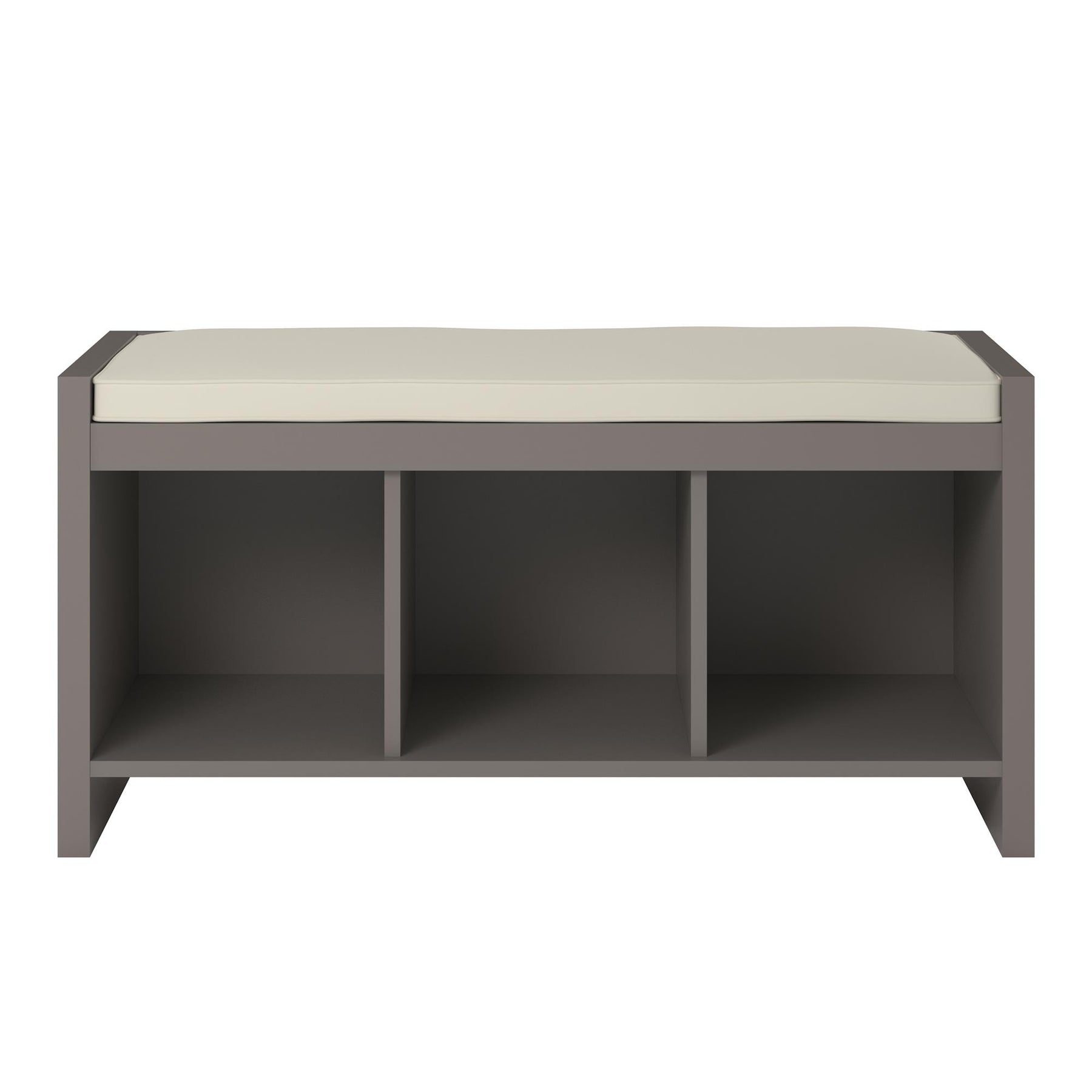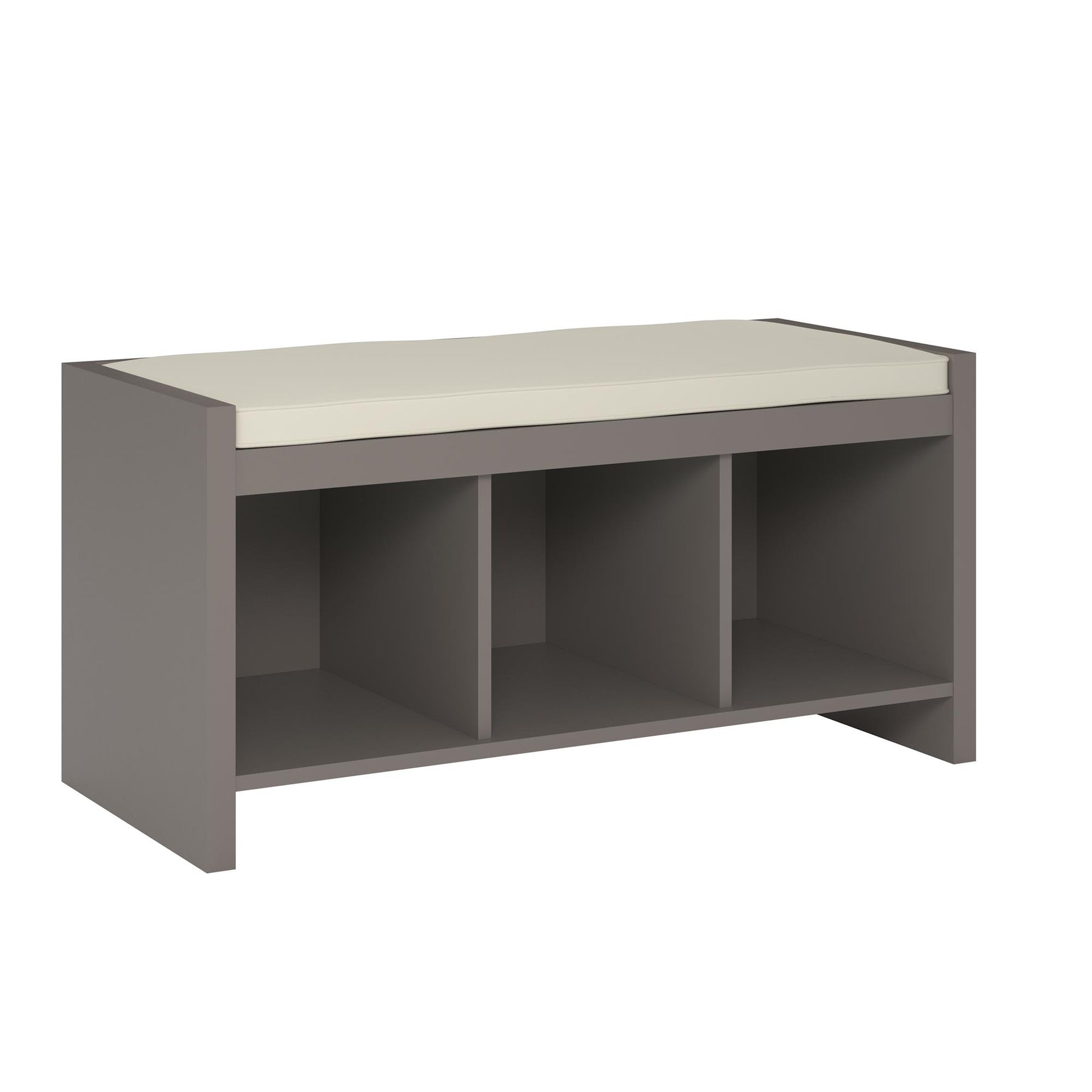 Give your home an inviting look with the Ameriwood Home Penelope Entryway Storage Bench with Cushion. The large top with a comfy cushion and 3 roomy cubbies can hold shoes, bags or books. With a gray finish with brown undertones and a beige pillow, the Bench makes a great addition to a variety of homes. Made from laminated hollow core and particleboard, this piece also looks great at the end a hallway or as extra seating in the living room. The Bench ships flat to your door and requires assembly upon opening. Two adults are recommended for proper assembly. Fitting perfectly into small spaces, this unit measures in at a compact 17.9"H x 35.9"W x 15.9"D.