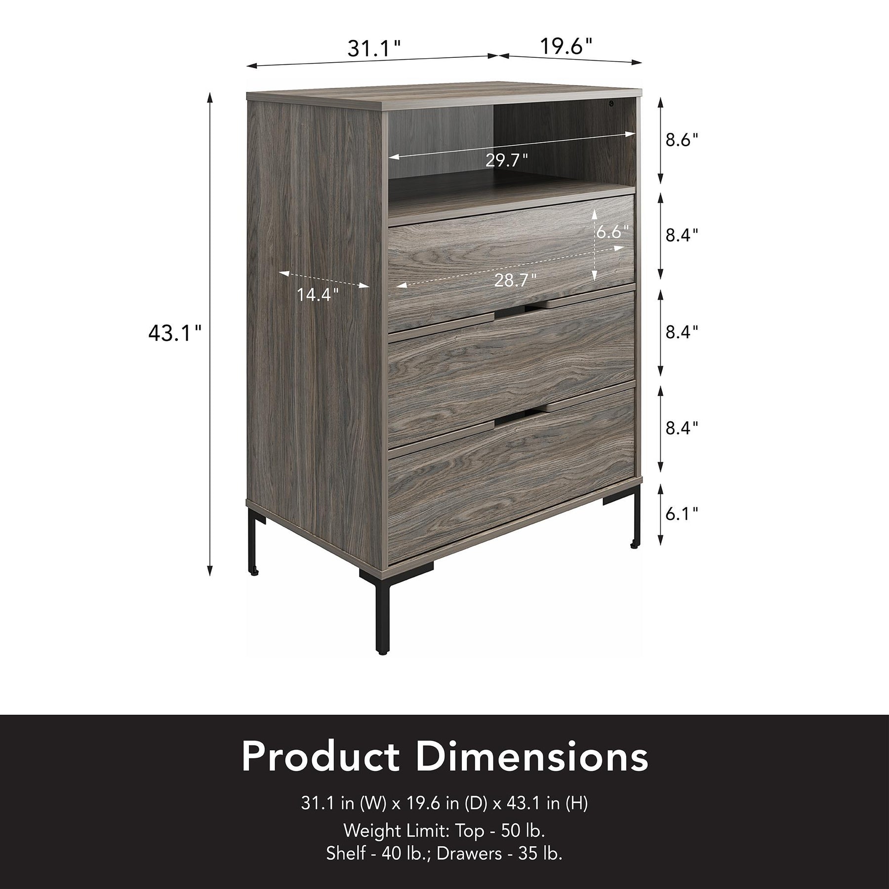 It's time to stop losing sleep over poor décor and give your bedroom a little face lift with the rustic, yet refined, Rolland collection by RealRooms. This simplified take on utilitarian forms is edgy enough to take on industrial spaces with a nod toward sophisticated elegance. The Tall Dresser features three spacious drawers and is constructed from durable MDF and engineered wood atop black powder coated metal legs. An open storage space above the drawers presents the perfect place for books and allows ample space to express your own unique flair, while the cut-out handles give the dresser a sleek, modern persona. This dresser ships flat to your door. Two adults are recommended for assembly. Assembled dimensions: 31.1"W x 19.6"D x 43.1"H. Top holds up to 50 lbs. and open shelf can hold up to 40 lbs. Drawers can hold up to 35 lbs.